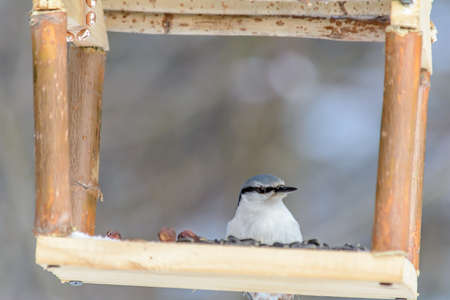 Bird Nuthatch Sitta europaea on bird feeder in winter in snowfall