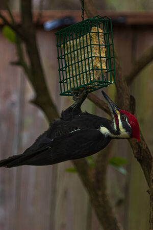 pileated adult woodpecker perched on a bird feeder eating in front of a fence