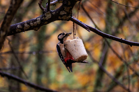 Woodpecker sitting on a feeder and eating seeds during autumn rain, wet feathers and bright plumage, atmospheric wildlife portrait with forest background.