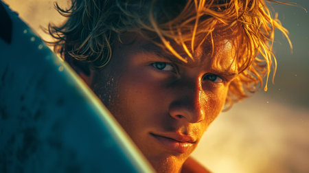 Portrait of a handsome young blond surfer holding a surfboard, shade from the sun's rays. Beach holiday concept. Generative AI.