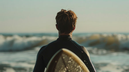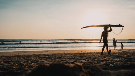silhouette of a young man in jacket looking at the sea at sunset with his surfboard, leisure and hobbies concept, copy space for text