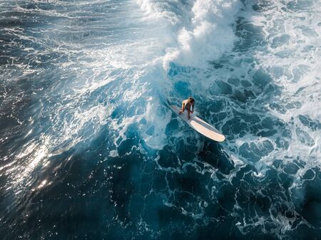 Aerial view of clear ocean water, waves and surfers at Bali island. Top view