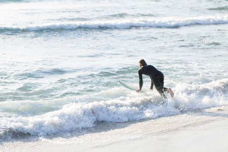 San Diego, California, USA - March 02, 2013 A surfer enjoying sunset at Windansea Beach, La Jolla, San Diego Windansea Beach is one of the most famous places for surfing in San Diego, California, USA