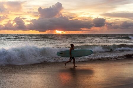Male surfer hand with surfboard walking along the beach shore, surfboard on the beach at sunset, sand and water in the background