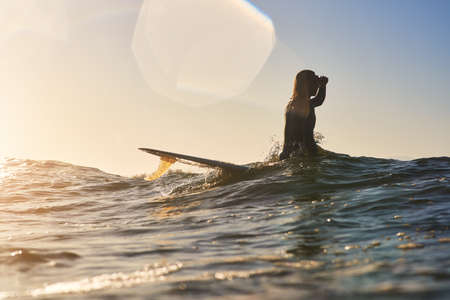 Surf girl rowing on the surfboard. Woman with surfboard in the ocean during surfing. Surfer and ocean