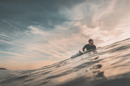 Young man waits in the sea, near the coast, on his surfboard, a big wave at sunset. Extreme water sports and outdoor active lifestyle. Vintage filter with soft style