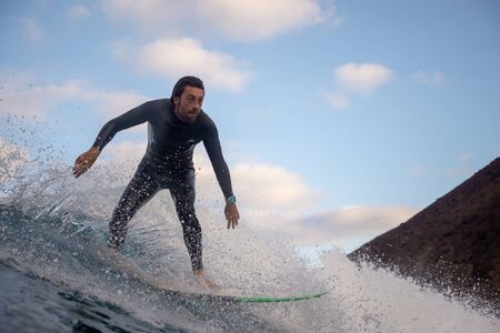 Surfer riding waves on the island of fuerteventura in the Atlantic Ocean, Canary Islands