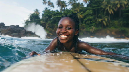 surfer lying on his surfboard and smiling happily while floating in the sea generative ai