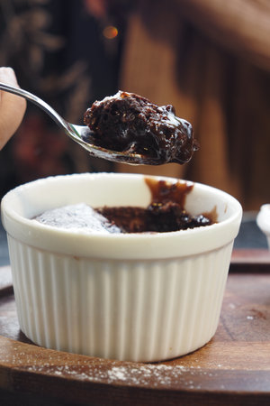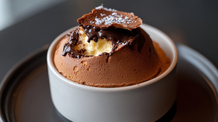 A rich chocolate souffle with soft, gooey center topped with crispy layer