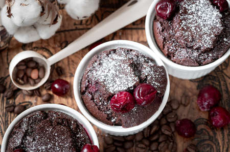 Chocolate and coffee homemade cake with cherries for breakfast in the form of muffins