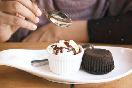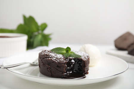 Delicious fresh fondant with hot chocolate, mint and ice cream served on white table