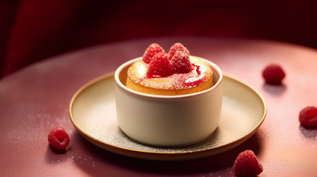 A gourmet European dessert of , served in a small ramekin with a spoon beside it. The table is set, but no one is present