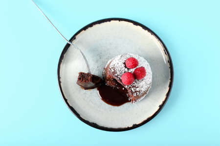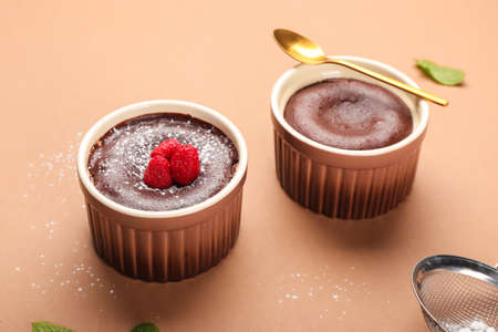 Ramekins with tasty lava cake fondant and raspberry on color background