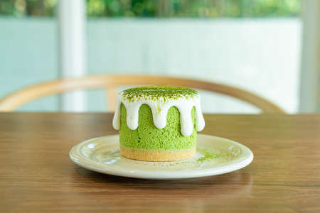 sweet vanilla and green tea caramel custard dessert on white plates with silver spoons put on a brown wooden table