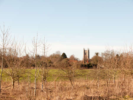 an english landscape with a view across fields of clover and wheat to a hilltop church under a blue sky