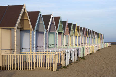 Multi-coloured holiday wooden beach huts facing the ocean on the beach of Tankerton Whitstable coast, Kent district England.