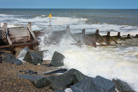Groynes to prevent coastal erosion with waves breaking onto a shingle beach.