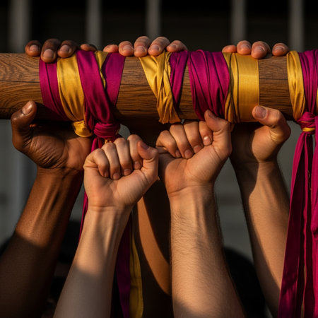 A visceral close-up focusing on the hands of two people collaborating to carry a heavy, unseen theat
