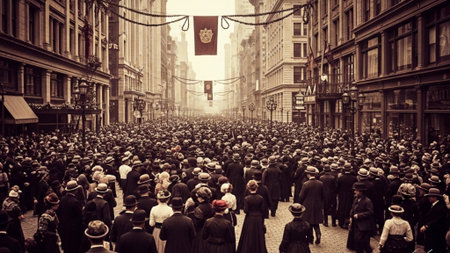 A cinematic, ultrawide 16:9 panoramic photograph capturing a massively crowded historic street corne
