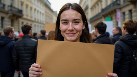 White girl stands firmly in a protest crowd, gripping blank sign. Her face shows determination as she joins others in an urban demonstration, fighting for justice