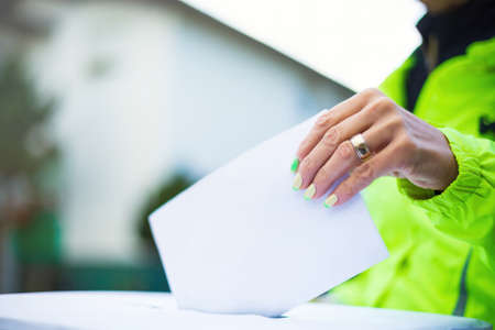 Womans hand voting at ballot box outside