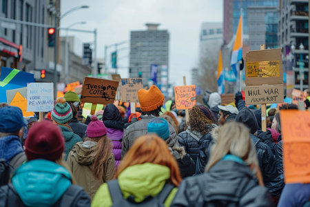 A vibrant protest march with a diverse group of individuals holding up colorful signs while demonstrating in the street, A lively protest march with colorful signs and banners