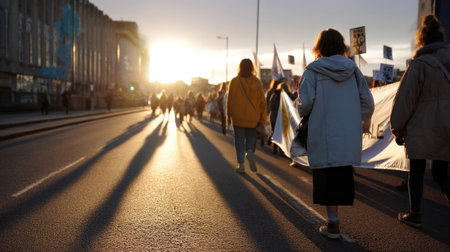 Women marching on a city street during a protest at sunset