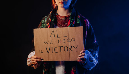Ukrainian woman with cardboard All we need is victory. Ukraine win war. Protest, democracy, liberty, demonstration, russian aggresion concept