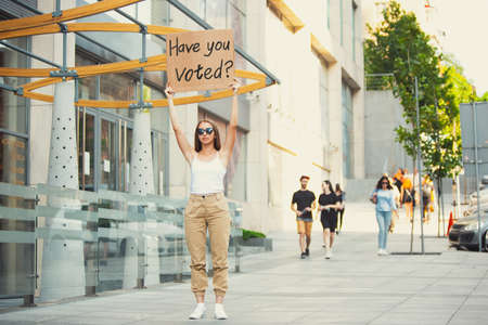 Have you voted. Dude with sign - woman stands protesting things that annoy her. Solo demonstration right to talk free on the street with sign. Opinion heard by public. Social life, politics, equality.