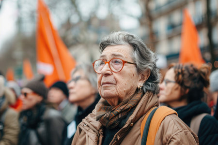 A woman wearing glasses and a brown jacket looks off into the distance during a protest in Paris. The orange flags and blurred cityscape behind her hint at the vibrant atmosphere surrounding her.