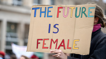 Person holding clear plastic sign with bold text 'THE FUTURE IS FEMALE' at protest. Feminist activism and equality movement concept