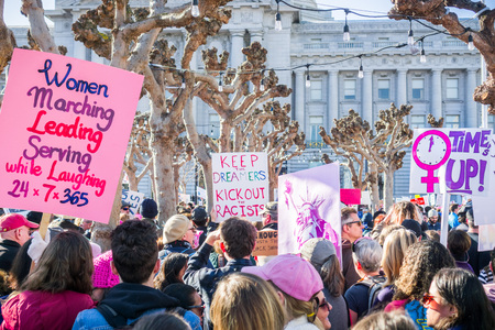 January 20, 2018 San Francisco / CA / USA - Various raised signs at the Women's March rally taking place in the Civil Center Plaza, in front of the City Hall