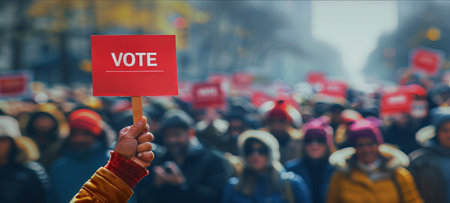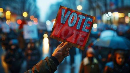 Person's Hand holding VOTE sign in crowded street. Urgent call for voting amid a busy urban setting. Concept of elections, democracy, civic duty, and political participation. Banner with copy space
