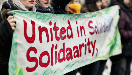 Group of people holding a large banner with a message of unity and solidarity