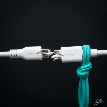 Macro still life (1:1 square) centered on a heavily damaged charging cable's strain relief, which is
