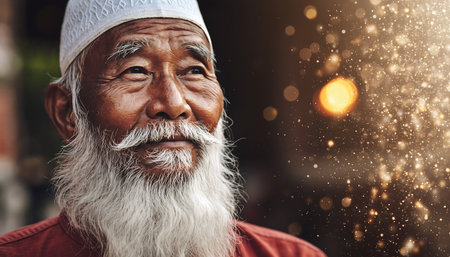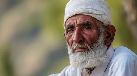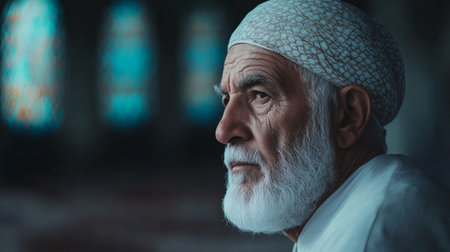 Portrait of an old man with white beard and mustache in the mosque