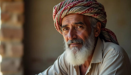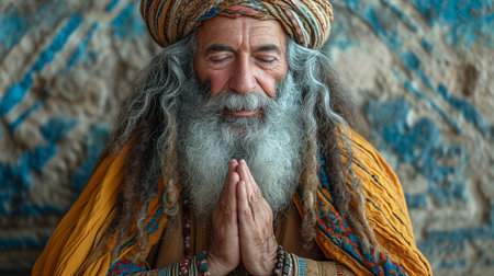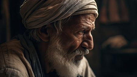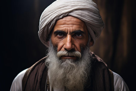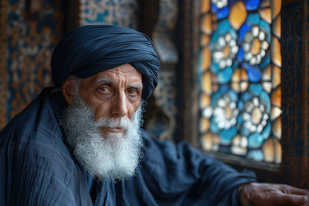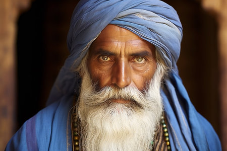 Portrait of an old man with a white beard and blue turban