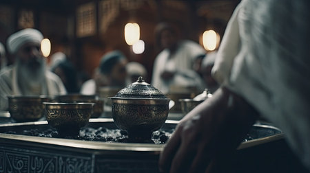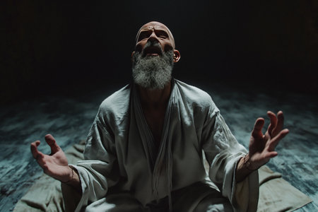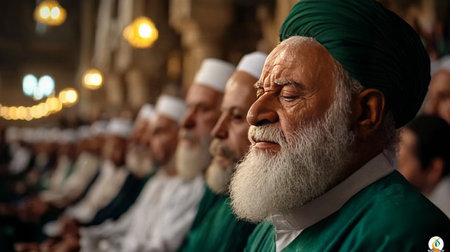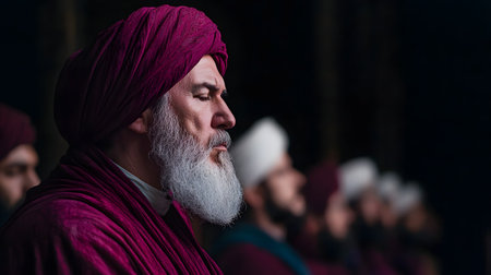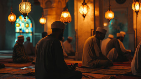 Several men in traditional garments engage in solemn prayer, exuding reverence and tranquility. The dark background enhances the reflective atmosphere of this spiritual gathering.
