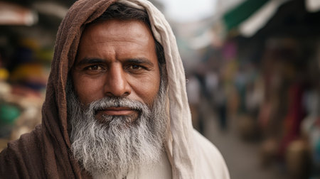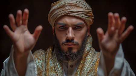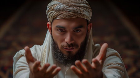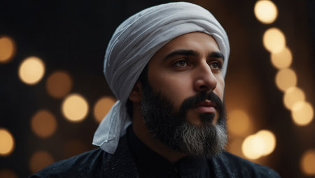 Portrait of a handsome Muslim man in a white robe and turban.