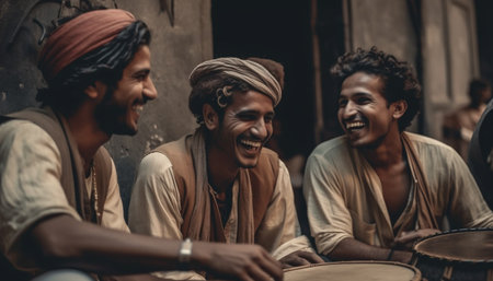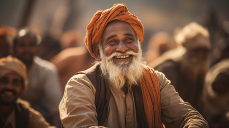 In a village in India, a group of elderly Muslim men engage in animated conversations, exchanging stories and wisdom amidst a colorful ambiance that defines their rustic community.