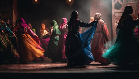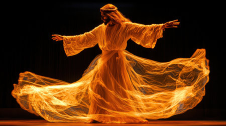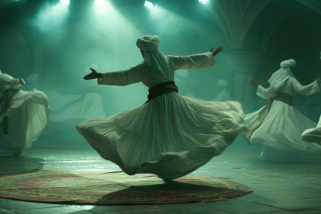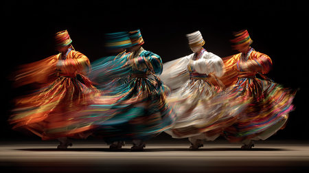 A lively group of individuals engaging in synchronized dance performances on stage, Floating dervishes in a mystical Sufi whirling ceremony, AI Generated