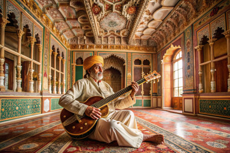 A man in a white robe sits on a rug playing a guitar. The room is decorated with colorful tiles and has a warm, inviting atmosphere