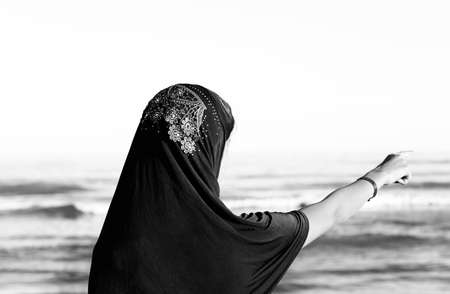 young girl with arabic veil to cover her head by the sea points away with black and white effect