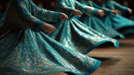 Closeup of a group of women gracefully whirling and spinning in a circle, their flowing skirts and intricate hand movements adding to the beauty and significance of a Sufi dance ceremony
