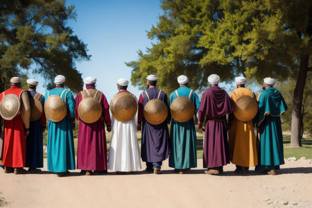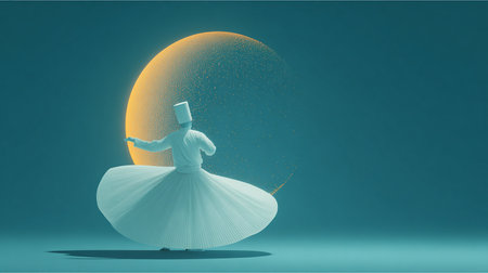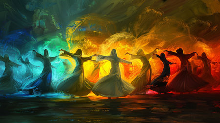 Sufi dervishes performing a whirling ceremony, mystical atmosphere, vibrant digital painting, spiritual dance