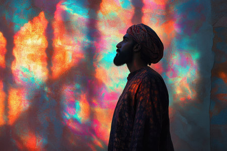A man poses steadily with a contemplative expression, framed by vibrant colors reflecting off the walls. The artistic lighting creates a stunning backdrop, adding depth to the environment during the evening hours.