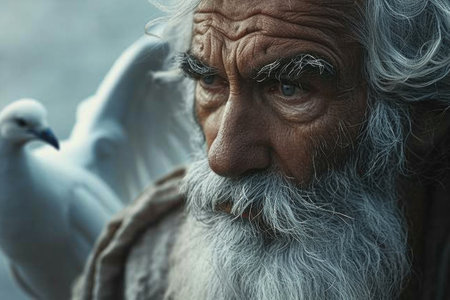 Poignant portrait biblical figure Noah stands hopeful anticipation, eyes fixed on horizon. Patiently waiting for improved weather, he yearns for return of dove, embodying Christian faith and resilience.