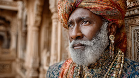 A man wearing a colorful turban and ornate jewelry stands gracefully, contemplating while surrounded by beautiful traditional architecture during sunset. His attire reflects cultural richness.