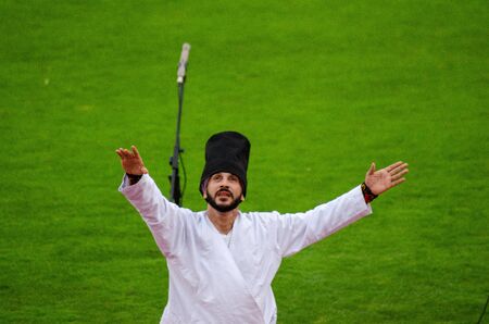 Unidentified Turkish dervish man performs Mevlevi,Sama Ceremony for a show at cafe in Istanbul,Turkey.05 May 2018