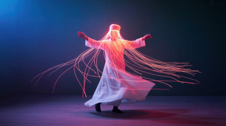 A person in a flowing white robe and head covering is captured mid-spin, arms outstretched. Numerous thin, glowing orange fiber optic strands emanate from the head and shoulders, fanning out and trailing behind in a dynamic, swirling motion. The background is a gradient of dark blue to purple, with a wooden floor reflecting the colored lights.